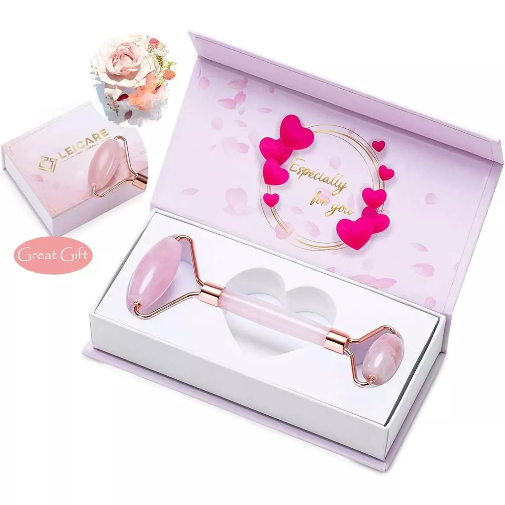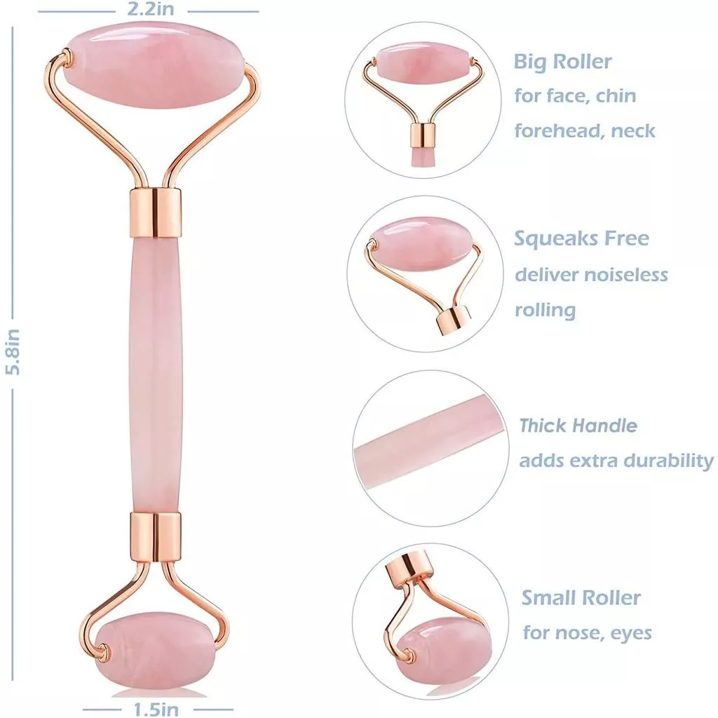 O rolo facial de cristal de mica pode reduzir rugas e inchaço, e pode clarear olheiras sob os olhos. Eles também estimulam o sistema linfático e promovem a circulação sanguínea. O uso regular e a longo prazo de rolos de quartzo rosa ou ferramentas de gua sha pode fechar os poros e reduzir linhas finas.