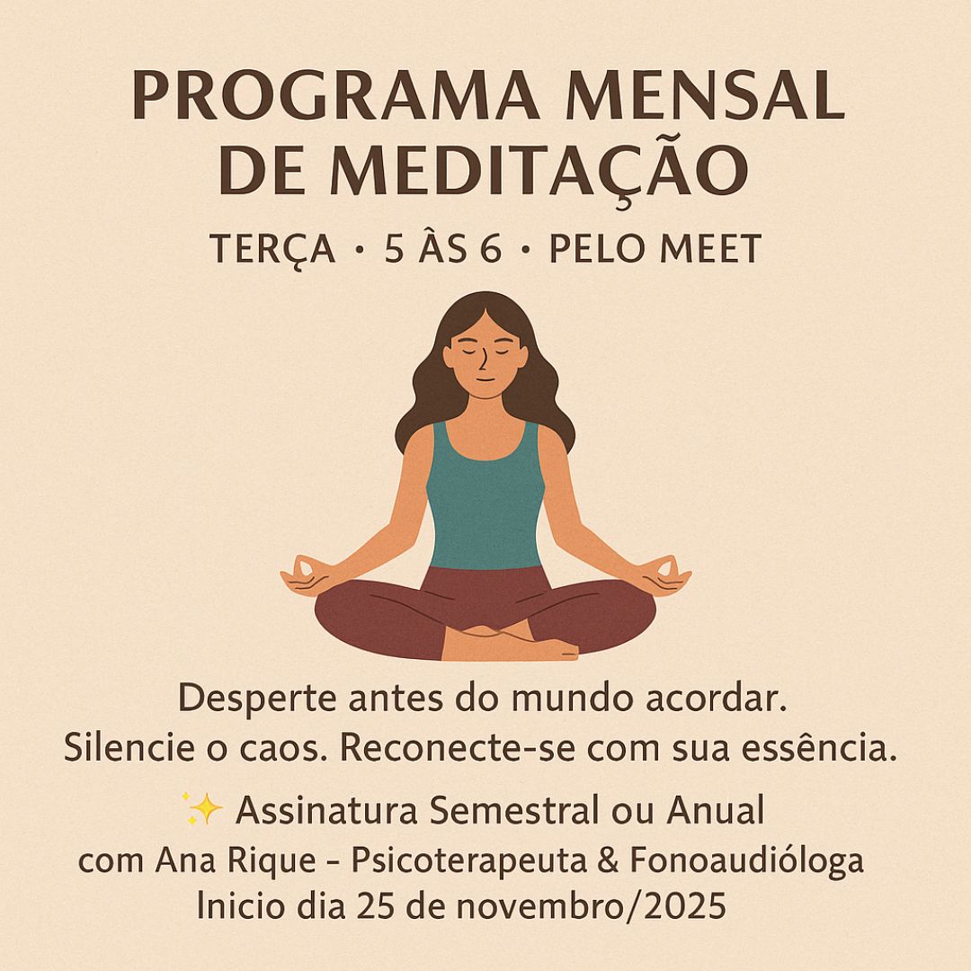 O Programa Mensal de Meditação com Ana Rique é um convite para mergulhar em um espaço de cura, silêncio guiado e expansão emocional.