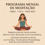 O Programa Mensal de Meditação com Ana Rique é um convite para mergulhar em um espaço de cura, silêncio guiado e expansão emocional.